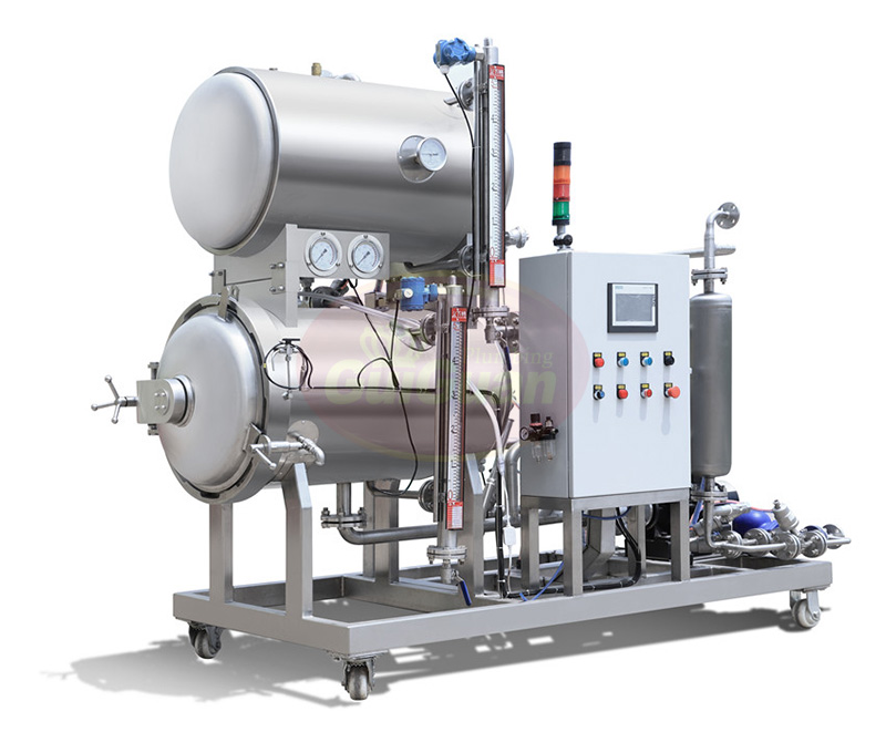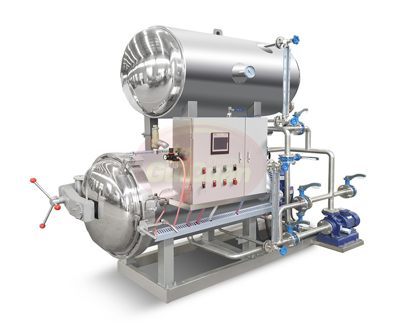 雙層水浴式殺菌鍋,殺菌水經過預熱,殺菌溫度起點高,縮短了殺菌時間,保護了產品品質。殺菌結束后的熱水回收至上罐,節約蒸汽、能耗和殺菌時間。針對軟包裝產品,特別是大塊頭包裝,熱穿透速度快,殺菌效果好。